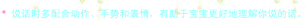 雖然大部分 1 歲左右的寶寶還不會(huì)說話,或者只能說很少的話,但是他們可以用手勢(shì)跟別人交流,你要多鼓勵(lì)他,當(dāng)然也要仔細(xì)觀察,及時(shí)替他表達(dá),翻譯他的手勢(shì)。