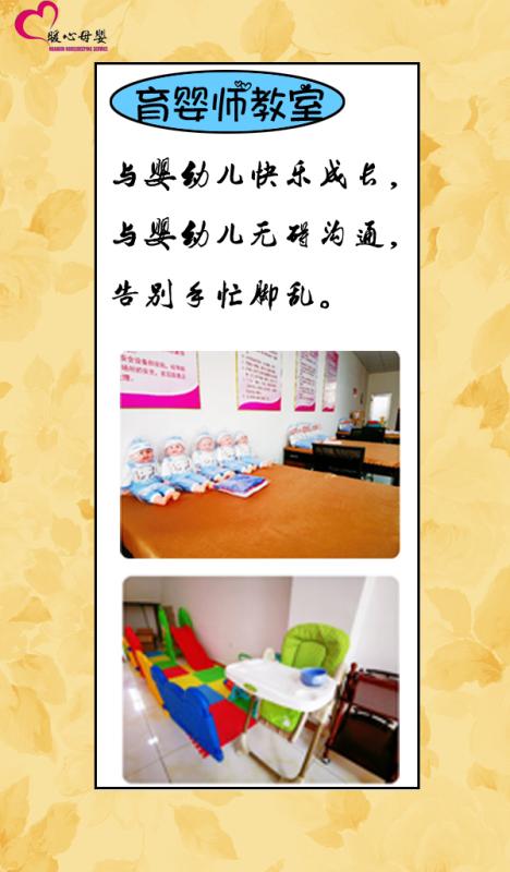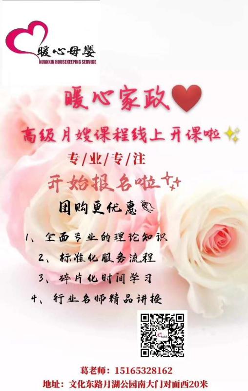 暖心家政于2013年經(jīng)青島市工商局批準(zhǔn)成立,具備獨(dú)立法人資格。是一家集母嬰護(hù)理,育嬰早教,老年護(hù)理為一體的綜合性服務(wù)機(jī)構(gòu),常年開(kāi)設(shè)高級(jí)月嫂 育嬰師,面點(diǎn)師、茶藝師,催乳師,養(yǎng)老護(hù)理等方面的課程培訓(xùn),培養(yǎng)社會(huì)需要的各方面專業(yè)人才。
