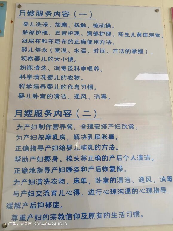 負(fù)責(zé)寶媽的日常護(hù)理和營養(yǎng)膳食,協(xié)助寶媽刷牙、梳頭、洗澡等工作,并做好寶媽的室內(nèi)衛(wèi)生等